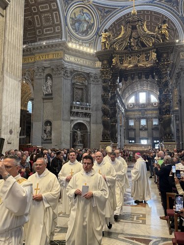 Nach so vielen Eindrücken, kommt die Mittagspause gerade recht, die, wir sind in Rom, wie soll es also anders sein, mit Pizza essen verbracht wurde. Im Anschluss geht es weiter, zur Basilika Santa Maria Maggiore. Bei der Ankunft wird klar, was zu dieser Wallfahrt auch gehört ist, das Anstehen und Abwarten. Doch das trübt die Stimmung in der Gruppe nicht. Beim Warten wird geplaudert und gebetet, sich ausgetauscht oder sinniert. In der Zwischenzeit gesellte sich auch Bischof Wiesemann zur Gruppe, der via Kopfhörer der Pilgergruppe beim Durchschreiten der Heiligen Pforte on Santa Maria Maggiore einige besinnliche Gedanken mitgab. Wer die Kirche erkunden wollte, konnte dies gemeinsam mit einer Touristenführerin machen. Und dann hieß es nochmal anstehen, um einen besonderen Moment vor dem Grab von Papst Franziskus zu erhaschen und für ihn zu beten.