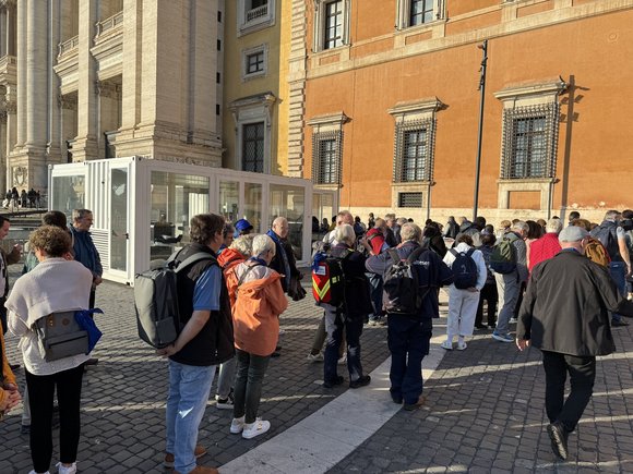 Ein wahrlich aufregender Tag liegt hinter uns oder mit anderen Worten: Dieser Tag war der Höhepunkt unserer Wallfahrt. Bereits um 6.45 Uhr ging es mit den Bussen von unseren Hotels aus los Richtung Petersplatz, denn heute stand die Generalaudienz mit Papst Leo XIV. auf dem Tagesprogramm. Neben den 357 Pilgerinnen und Pilgern aus Speyer wurden weitere 60.000 – 80.000 Gläubige erwartet. Eine unbeschreibliche Zahl, die in den vollen Straßen Roms spürbar war. Das Ziel war es natürlich: Papst Leo so nahe wie möglich zu kommen und eins oder auch zwei, oder vielleicht auch mehrere Fotos als Erinnerung mitnehmen zu können. Als wir auf dem Petersplatz ankamen, hieß es erstmal durchatmen: Die erste Hürde war geschafft. Und mit Blick auf die Uhr war auch gar nicht mehr viel Zeit, um einen guten Stehplatz zu ergattern. Kurz vor 10.00 Uhr erblickten wir ihn dann, wie er mit seinem Papamobil durch die abgesperrten Wege bis zum Petersdom fuhr. Ein wirklich besonderer Moment! Aufregung macht sich in der Gruppe breit, es wurde gejubelt und gerufen!